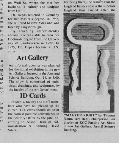 The Arts and Sciences Building is completed, providing a functioning Art Department, including studios and a large exhibition space, soon known as The Art Gallery of Kingsborough Community College. The inaugural exhibition, a faculty show, opened informally on October 14, 1976.